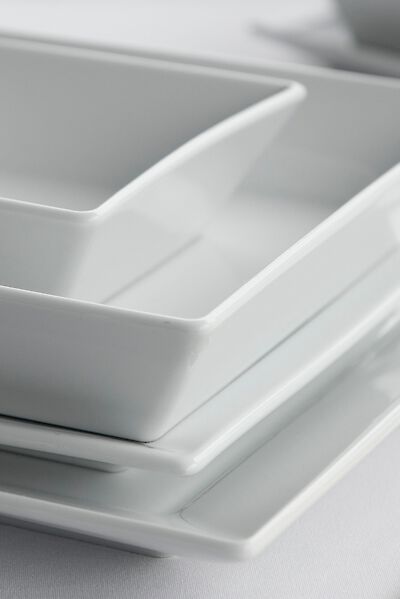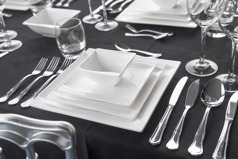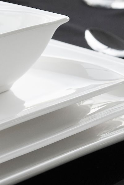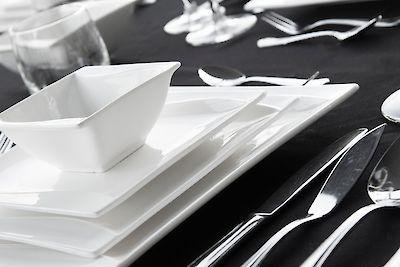 De asymmetrische vormen en de gebogen lijnen maken dit servies tot een ware eyecatcher. Het zwarte tafelkleed geeft nog meer accent aan dit trendy servies.